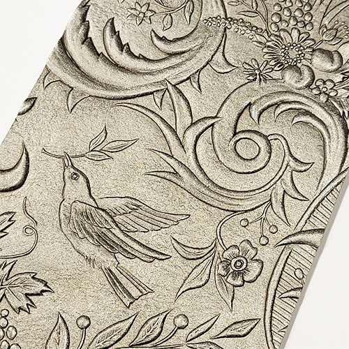 江戸時代にオランダとの貿易により輸入された金唐革の代用品として和紙を使うことで、擬革紙の技術を培い、金唐革紙として明治期に輸出するまでになりました。重厚なロール状の版木を使い、和紙を手打ちして柄を打ち出し、銀箔、柿渋、叩き刷毛、ワニスなどを用い彩色しています。凹凸状のデザインが美しい革風の紙です。