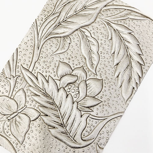 江戸時代にオランダとの貿易により輸入された金唐革の代用品として和紙を使うことで、擬革紙の技術を培い、金唐革紙として明治期に輸出するまでになりました。重厚なロール状の版木を使い、和紙を手打ちして柄を打ち出し、銀箔、柿渋、叩き刷毛、ワニスなどを用い彩色しています。凹凸状のデザインが美しい革風の紙です。
