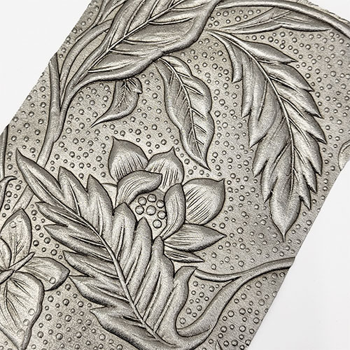 江戸時代にオランダとの貿易により輸入された金唐革の代用品として和紙を使うことで、擬革紙の技術を培い、金唐革紙として明治期に輸出するまでになりました。重厚なロール状の版木を使い、和紙を手打ちして柄を打ち出し、銀箔、柿渋、叩き刷毛、ワニスなどを用い彩色しています。凹凸状のデザインが美しい革風の紙です。