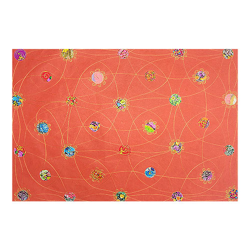 紙をベースにミシンで様々なデザインの刺繍を施したインドのししゅうペーパー。様々な模様の布を丸く抜いたものが手毬に見立てて貼られています。