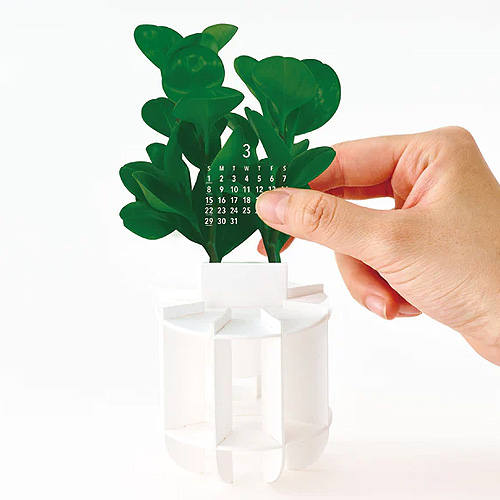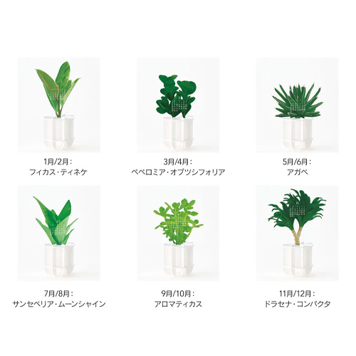 観葉植物をモチーフにしたカレンダーです。ポット型の台座を組みたて、その月のカレンダーの植物を差し込んで使います。アメリカ、ヨーロッパなど海外の美術館、博物館でも大変人気の高い商品です。